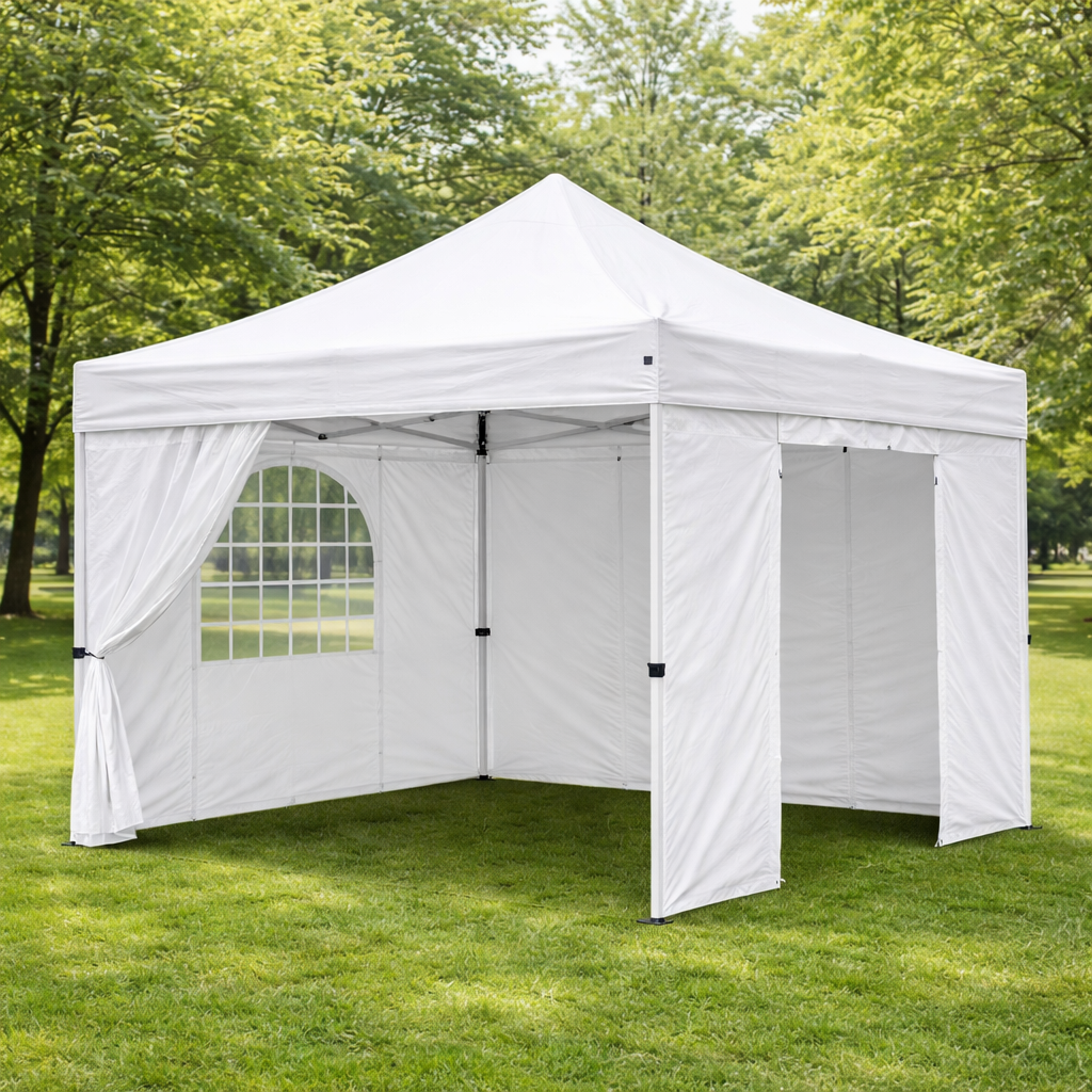 A 10×10 Pop Up Canopy with Sidewalls is a compact, heavy-duty outdoor shelter designed to provide instant protection from sun, rain, and wind, featuring a sturdy steel or aluminum frame with a quick pop-up setup, a spacious 10×10-foot coverage area ideal for events, markets, camping, or backyard use, and removable sidewalls that offer added privacy, weather resistance, and ventilation options while being made from durable, waterproof, and UV-resistant fabric for long-lasting performance in various outdoor conditions.