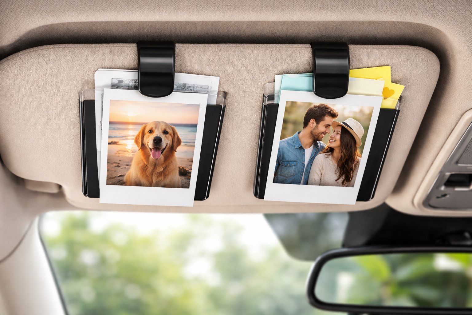 2Pcs Car Visor Photo Clip is a simple yet practical car accessory designed to attach easily to your vehicle’s sun visor, allowing you to hold photos, cards, or small notes securely. Made from durable and sturdy material, it keeps items firmly in place without slipping while driving. Its compact and minimal design blends well with the car interior without causing distraction, while the strong grip protects photos from bending or damage. The set includes two clips, making it convenient for everyday use and easy to install without any tools.
