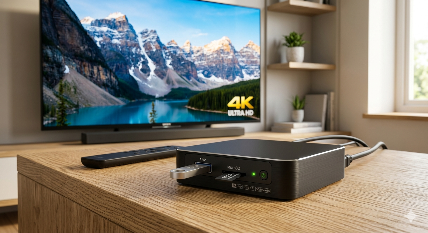 The 4K Media Player for USB Drive & MicroSD is a compact device that lets you effortlessly play high-definition videos, photos, and music directly from USB drives or MicroSD cards. Supporting 4K Ultra HD resolution, it delivers sharp, vibrant visuals and clear audio for an immersive viewing experience. Compatible with a wide range of media formats, it features an easy-to-navigate interface, plug-and-play operation, and HDMI output for seamless connection to TVs or monitors. Its lightweight, portable design makes it ideal for home entertainment or on-the-go media playback.