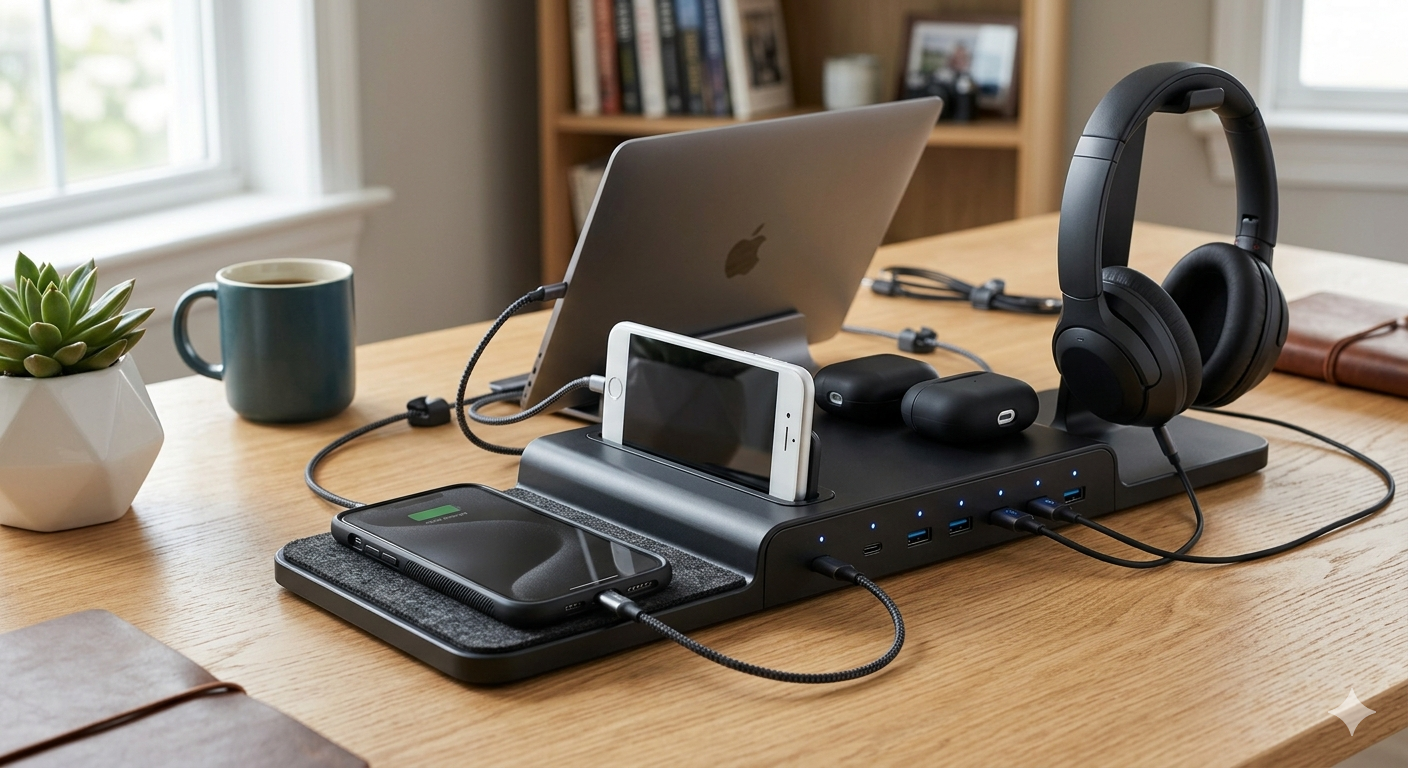 A 690W charging station for multiple devices is a powerful all-in-one solution designed to keep your entire setup organized and fully powered . With high total output, it can simultaneously charge laptops, smartphones, tablets, smartwatches, and other USB or AC-powered gadgets without slowing down performance. Multiple ports, including USB-C, USB-A, and AC outlets, offer wide compatibility, while built-in safety features like overcurrent, overvoltage, and temperature protection ensure safe operation. Its compact, space-saving design reduces cable clutter, making it ideal for home offices, workstations, or travel, so you can conveniently power all your essential devices from one reliable hub .