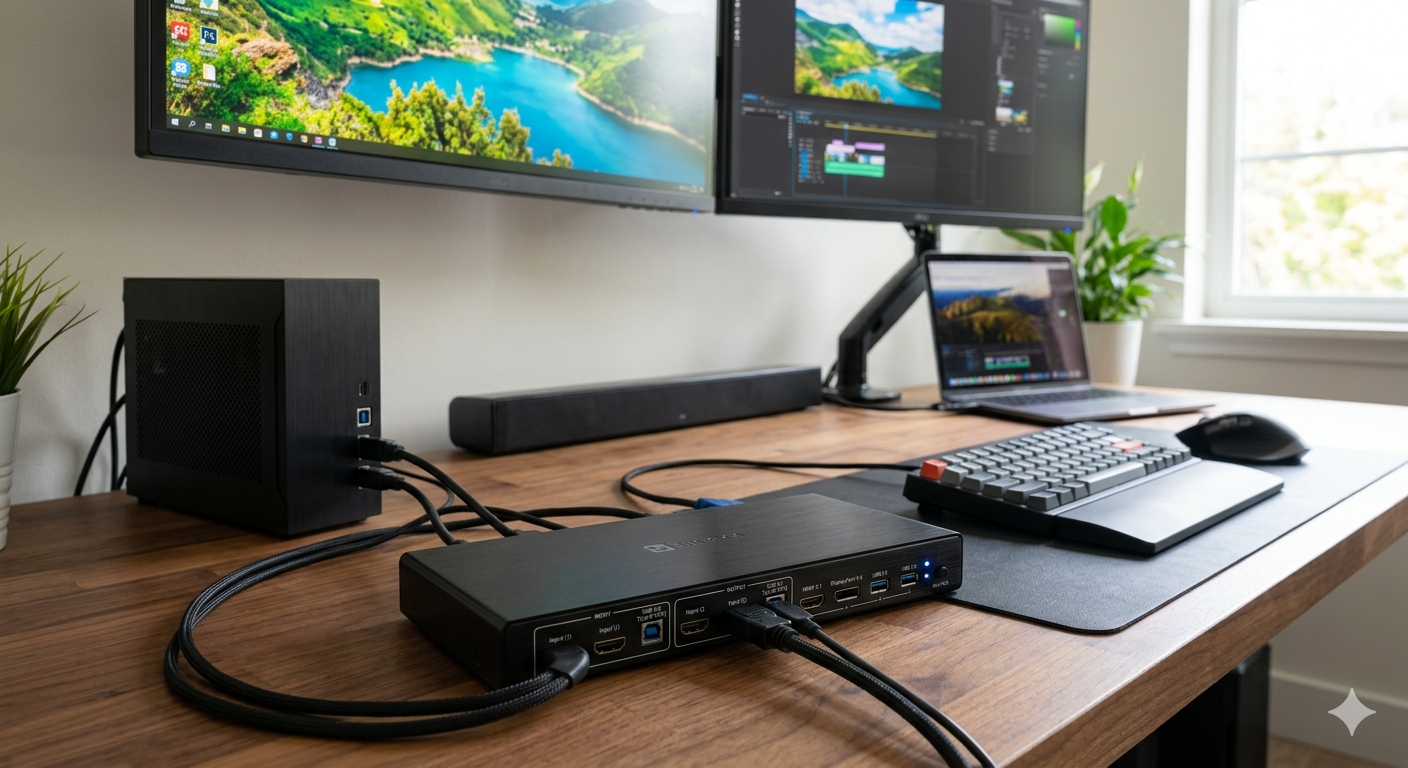The 8K 60Hz DisplayPort HDMI KVM switch is a high-performance device designed to let you control multiple computers using a single keyboard, mouse, and monitor setup. Supporting both DisplayPort and HDMI connections, it delivers stunning 8K resolution at 60Hz for ultra-clear visuals, making it ideal for professional workstations, gaming, or creative applications. Its seamless switching functionality allows users to toggle between connected systems effortlessly, while maintaining full audio and video fidelity. Compact and reliable, this KVM switch simplifies multi-device management without compromising performance.