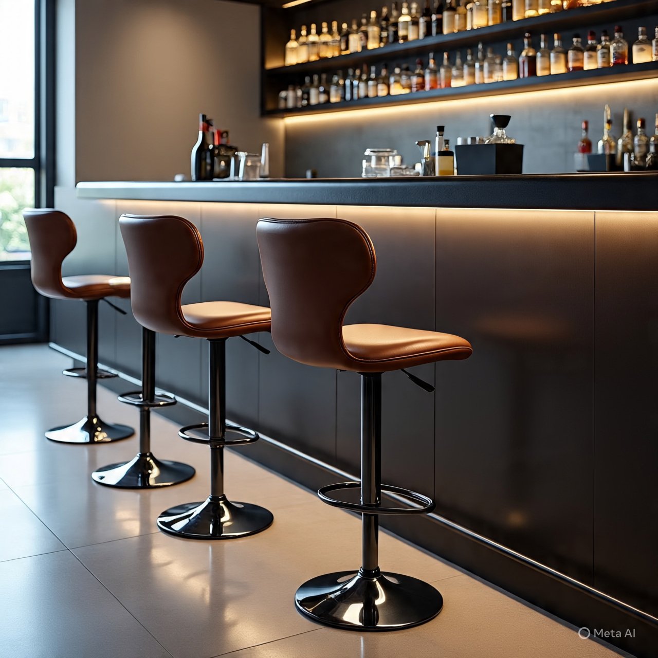 These adjustable bar stools feature a sleek modern design with smooth PU leather upholstery that is easy to clean and comfortable for everyday use. The curved mid-back provides gentle support for your lower and mid back, helping you sit comfortably for longer periods. With a smooth 360° swivel, you can turn freely without moving the stool, making conversations and movement effortless. The height-adjustable mechanism allows a perfect fit for different counter and bar heights, while the sturdy metal base and built-in footrest add stability and support, making these bar chairs both stylish and practical for kitchens, dining areas, or home bars.