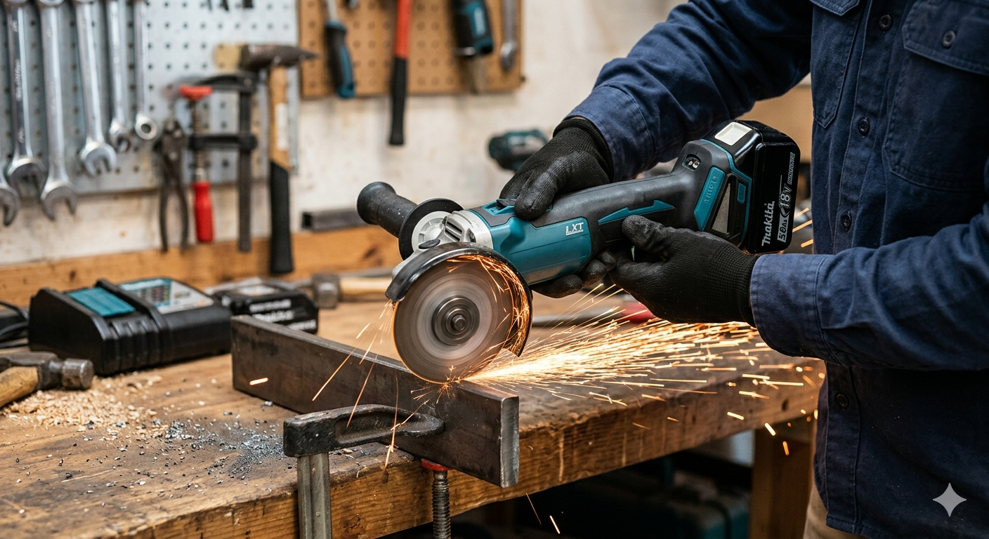A Makita cordless grinder is a powerful and portable tool designed for cutting, grinding, and polishing a wide range of materials such as metal, stone, and concrete without being restricted by a power cord. Built with a high-performance motor and advanced lithium-ion battery technology, it delivers strong, consistent speed and efficiency for both professional and DIY applications. Known for durability and ergonomic design, it offers a comfortable grip, safety features like overload protection, and quick accessory changes for convenience on the job. Manufactured by Makita, it is widely trusted in construction and workshop environments for its reliability, long battery life, and smooth performance in demanding tasks.