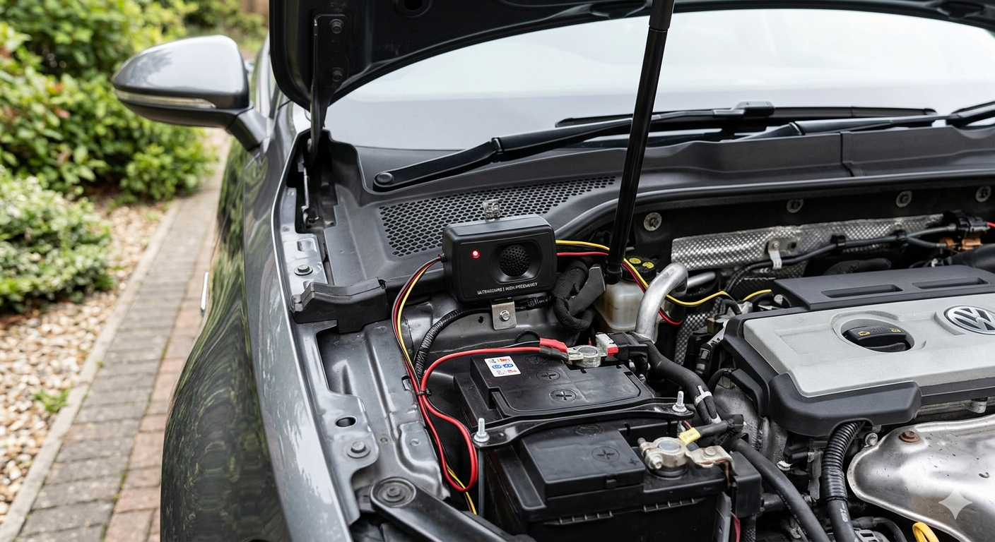A Marten Deterrent Car with Ultrasound is an electronic device designed to protect vehicle wiring, hoses, and insulation from damage caused by martens and other small animals. It works by emitting high-frequency ultrasonic sound waves, often combined with flashing LED lights, which are unpleasant to animals but inaudible to humans, discouraging them from entering the engine bay. Typically powered by the car battery or internal batteries, these deterrents feature low power consumption, automatic operation, and weather-resistant construction for reliable performance in various conditions. Easy to install inside the engine compartment, the device helps prevent costly repairs by keeping rodents and martens away from sensitive components without using chemicals or traps.