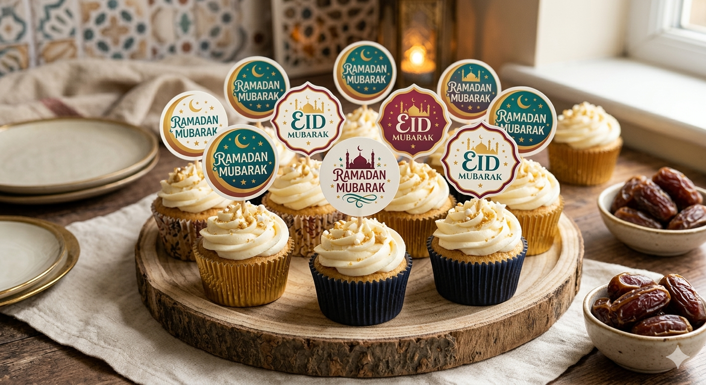 Ramadan Mubarak Eid Cupcake Toppers made from edible wafer paper are a fun and festive way to decorate your desserts during the holy month and Eid celebrations. These lightweight, food-safe toppers feature beautiful Ramadan and Eid designs such as crescent moons, stars, lanterns, and “Ramadan Mubarak” messages, adding a charming touch to cupcakes, cakes, and other sweets. Easy to place on frosting, they instantly transform homemade or store-bought treats into eye-catching desserts perfect for iftar gatherings, Eid parties, family celebrations, or special events. Made from high-quality edible wafer paper, they are safe to eat and help create a delightful and memorable presentation for your festive desserts.