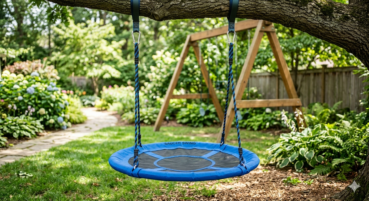 The Saucer Swing is a fun and versatile outdoor play accessory designed for kids and adults alike. Its large, round, disc-shaped seat provides a comfortable and secure place to sit or lie while swinging, spinning, or gently gliding back and forth. Made from durable, weather-resistant materials with sturdy ropes and a strong frame, it can support multiple users safely and withstand regular outdoor use. Easy to hang from trees or swing sets, it offers hours of active play, encourages physical activity, and helps develop balance and coordination in a playful, engaging way.
