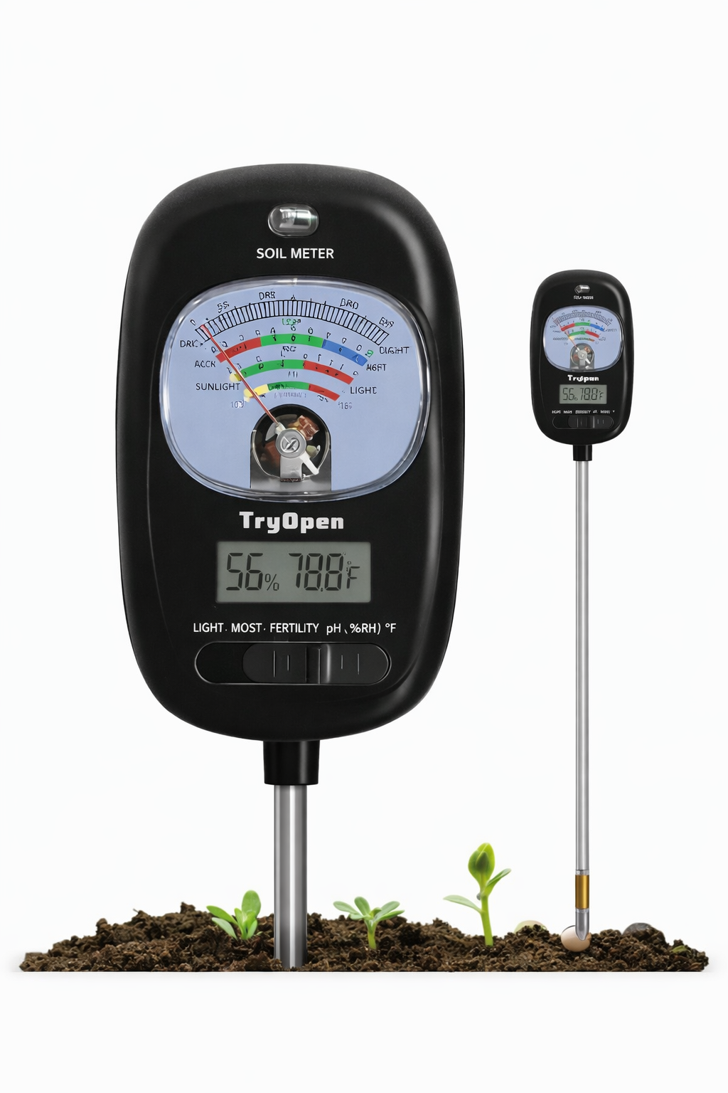 Soil Master meter for plants is a simple yet effective gardening tool designed to measure the moisture level (and sometimes pH and light) of soil to ensure healthy plant growth. It typically consists of a probe that is inserted into the soil and a dial or display that instantly shows whether the soil is dry, moist, or wet, helping users decide when to water their plants. These meters are widely used for both indoor and outdoor plants, including pots, gardens, and trees, and are especially useful in preventing overwatering or underwatering—two common causes of plant damage. Most Soil Master meters are easy to use, require no batteries, and provide quick, reliable readings, making them a convenient solution for maintaining optimal soil conditions and improving