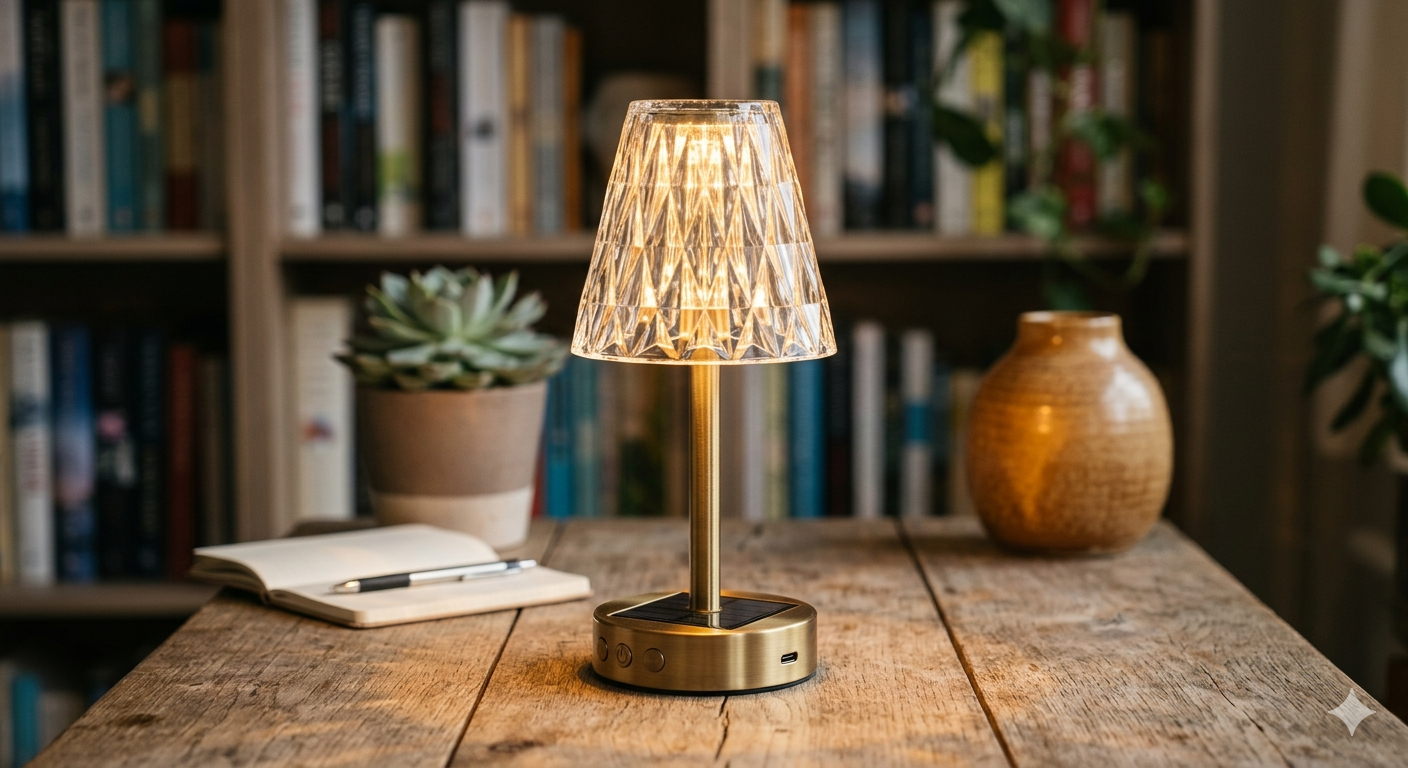 The Solar Crystal Table Lamp Cordless Rechargeable LED Desk Light combines elegant design with practical functionality, featuring a crystal-style body that creates a beautiful ambient glow in any room. This cordless lamp is powered by a rechargeable battery and can also harness solar energy, making it energy-efficient and convenient for both indoor and outdoor use. With touch or button controls, it offers adjustable brightness levels to suit reading, dining, or relaxing atmospheres. Its portable, wire-free design allows you to place it on desks, bedside tables, patios, or cafés without worrying about power outlets, while the durable build and modern aesthetic add a stylish touch to any décor.