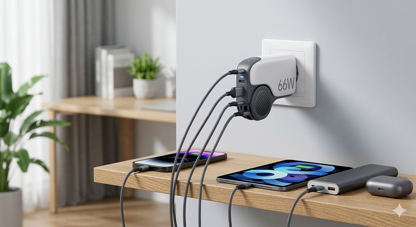 The Upgraded 66W 4-in-1 Retractable Wall Charger is a powerful and space-saving charging solution designed for modern devices. It features a high-speed 66W output that can quickly charge smartphones, tablets, and other gadgets while the 4-in-1 design allows you to power multiple devices at the same time. The built-in retractable cables keep your space neat and tangle-free, making it perfect for home, office, or travel use. With advanced safety protection against overheating, overcharging, and short circuits, this charger delivers reliable and efficient performance while keeping your devices safe. Its compact wall-mounted design ensures convenience and easy storage without messy wires.