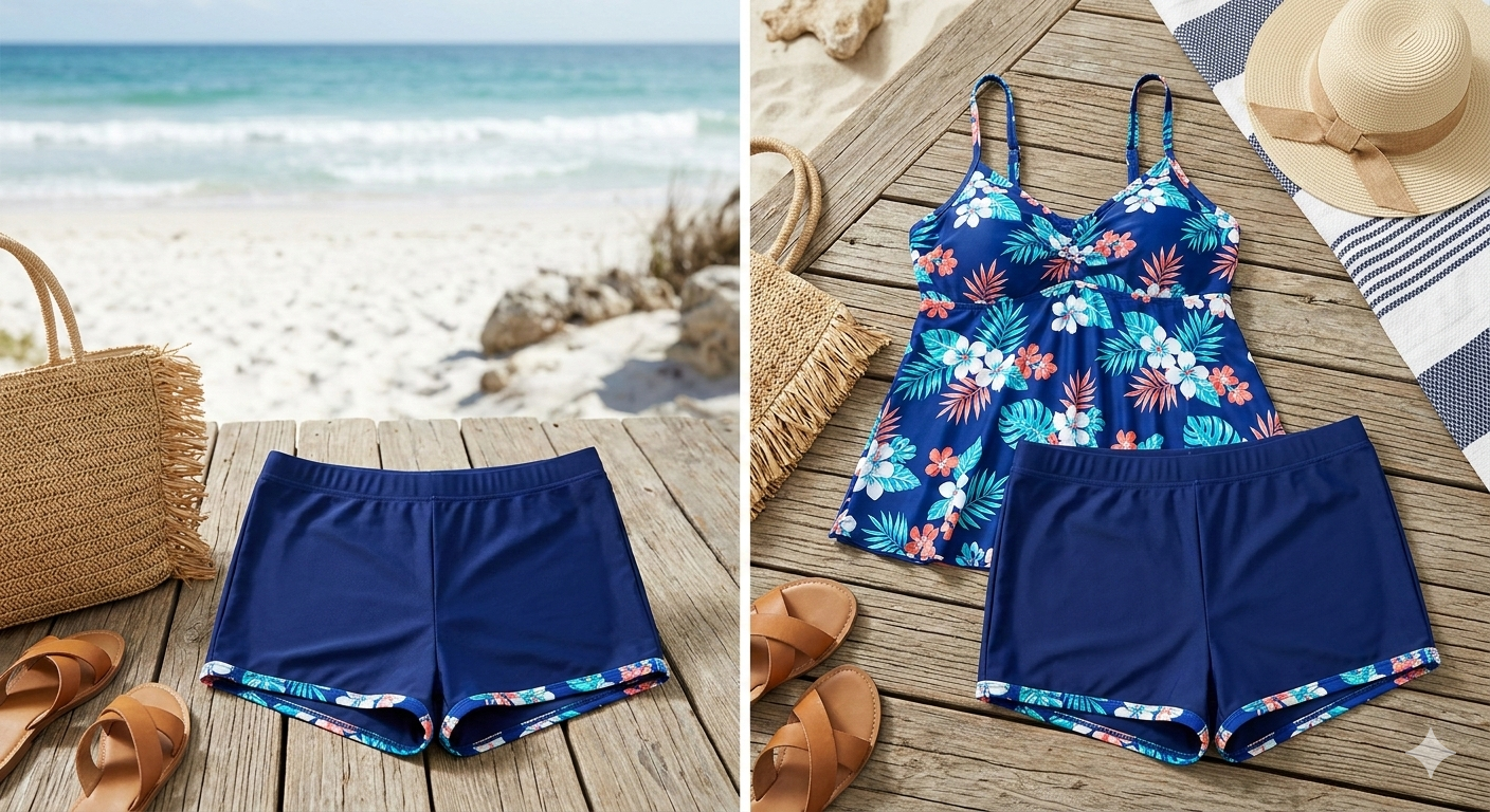 This women’s two-piece tankini swimsuit with swim shorts is designed to offer both comfort and confidence for swimming, beach outings, or poolside relaxation. The tankini top provides modest coverage while maintaining a stylish, modern look, and the matching swim shorts add extra freedom of movement, making it perfect for active water fun. Made from soft, stretchy, and quick-drying fabric, this swimsuit ensures a comfortable fit that moves with your body. The breathable material helps keep you cool in warm weather, while the durable stitching supports long-lasting wear. Whether you are swimming, sunbathing, or enjoying summer adventures, this two-piece tankini set combines fashion, practicality, and ease of use.