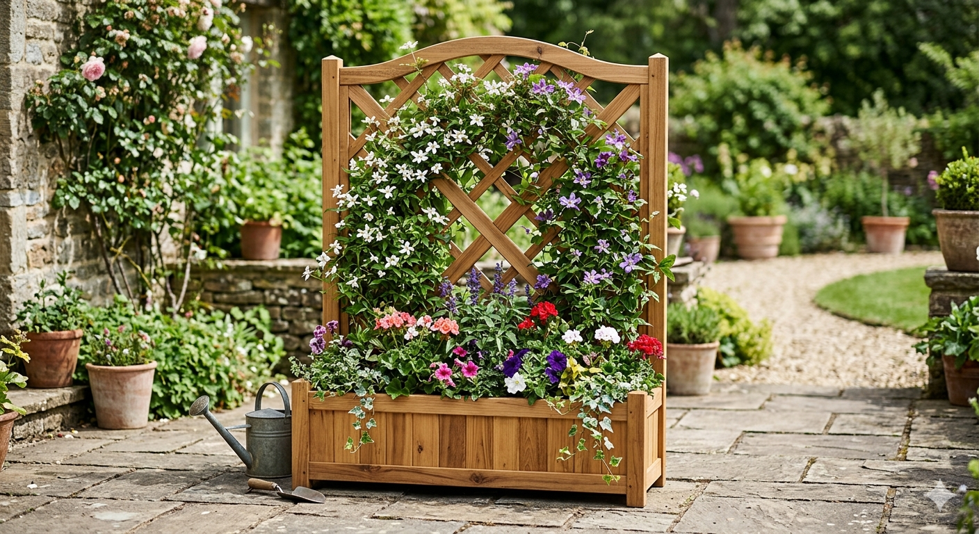 This Wood Planter with Trellis is a stylish and functional addition to any garden or patio, combining a sturdy wooden planter box with an integrated trellis for climbing plants. Crafted from durable, weather-resistant wood, it provides ample space for flowers, herbs, or small vegetables, while the trellis supports vines and creepers, encouraging vertical growth and enhancing visual appeal. Its natural finish complements outdoor spaces, and the compact design makes it suitable for balconies, decks, or garden corners, offering both practicality and aesthetic charm in one piece.